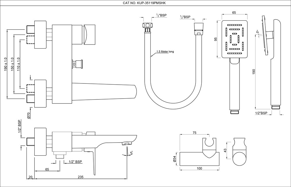 Single Lever Bath & Shower Mixer with Shower Kit (1657, 571 & 555) Wall Mounted